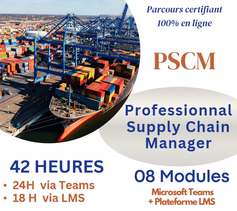 Cette formation certifiante offre aux participants une vision à 360° sur les métiers de la Logistique et de la Supply Chain Notre programme labelisé et rigoureux couvre tous les aspects clés de la planification, de l’achat et l’approvisionnement à la gestion des opérations industrielle, en passant par le Transport et l’excellence opérationnelle... Plein d’études de cas réelles et des outils éprouvés pour vous aider à relever les défis les plus pressants de l'industrie. La formation proposée est une formation dite « Mix Learning» car elle intègre 08 cours via notre plateforme LMS sur les fondamentaux et les pratiques métier Supply Chain étalés sur 42 Heures en e-learning pendant lesquels les participants réaliseront des travaux pratiques et des exercices en groupe afin de bien assimiler et de mettre en valeur les outils et les concepts initialement appris en ligne et sur la plateforme LMS . 04 heures par semaine en mode synchrone (Teams) sont planifiées afin de boucler la certification en 02 Mois maximum. Un travail individuel sur notre plateforme LMS de 02 Heures chaque semaine s’avère obligatoire entre les séances afin de boucler les 42 Heures. Une évaluation est réalisée en fin de formation afin de valider les acquis et obtenir le certificat complet. Le participant qui souhaite avoir en plus un Certificat «Professionnel Supply Chain Manager » validé par « The American Institute For Applied Education » accréditation EOQM, est tenu de payer les frais du voucher d’examen.