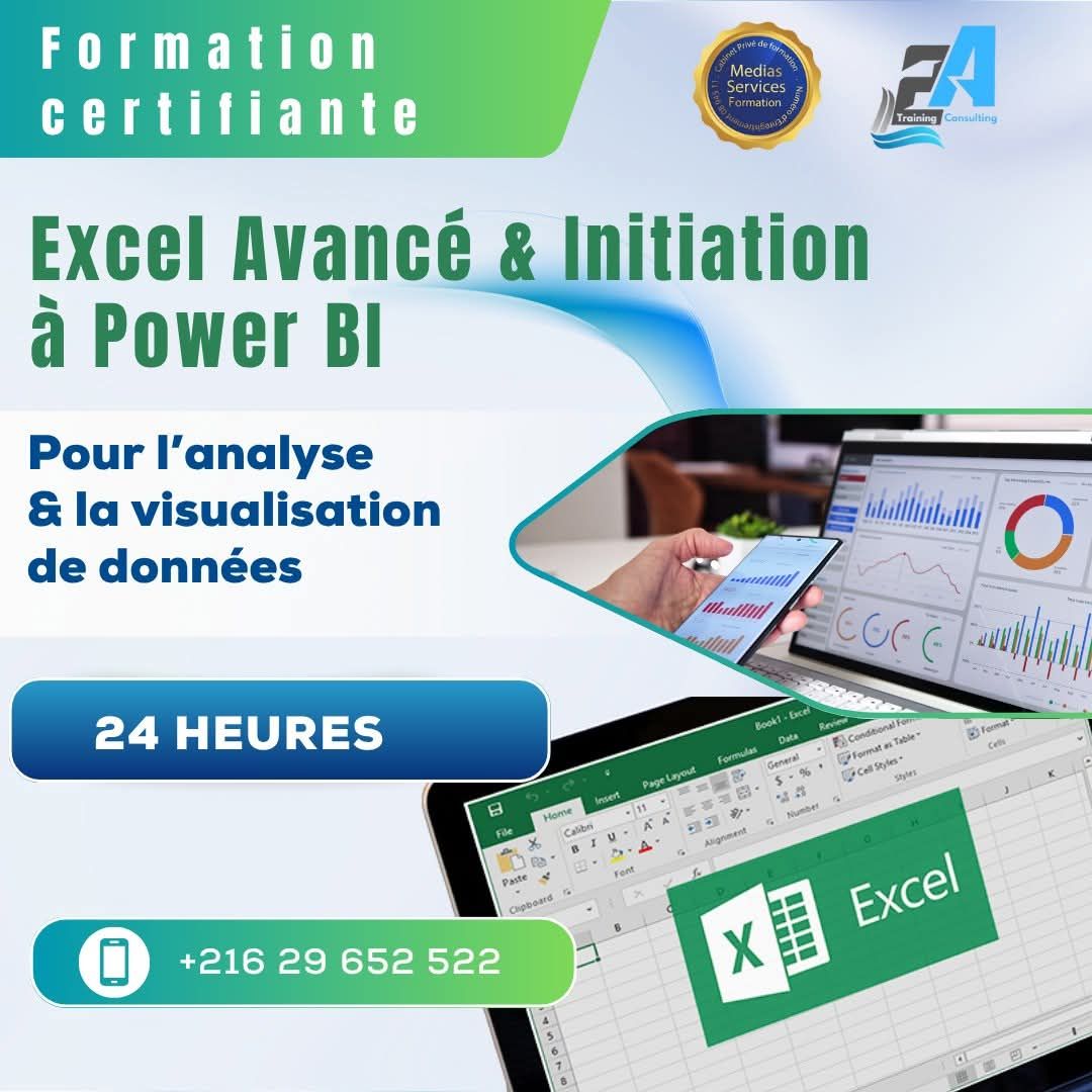 Maîtrisez Excel Avancé et initiez-vous à Power BI, deux outils incontournables pour gagner en efficacité, automatiser vos analyses et créer des tableaux de bord interactifs. ✅ Objectifs : Exploiter les fonctions avancées d’Excel (formules, TCD, Power Query) Automatiser l’analyse et la visualisation des données Créer des tableaux de bord dynamiques avec Power BI Desktop 🎁 Pourquoi s’inscrire ? ✔️ Approche 100 % pratique ✔️ Formateur expert & pédagogue ✔️ Certificat de formation délivré ✔️ Support complet + fichiers d’exercices offerts